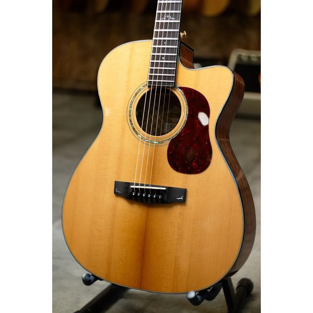 Cort Gold-OC6-NAT Gold Series Электроакустичесая гитара (б\у). Форма корпуса: оркестровая, с вырезом. Мензура: 643мм. Верхняя дека: массив ситхинской ели, подсушенная. Задняя дека и обечайка: массив красного дерева. Гриф: красное дерево. Накладка грифа и бридж: черное дерево. Крепление грифа: ласточкин хвост. 20 ладов. Ширина верхнего порожка: 43мм. Колковая механика: Deluxe Vintage. Розетка с перламутром, черная окантовка. Электроника: Fishman Flex Blend System. Ультрафиолетовое покрытие. Цвет: натуральный.