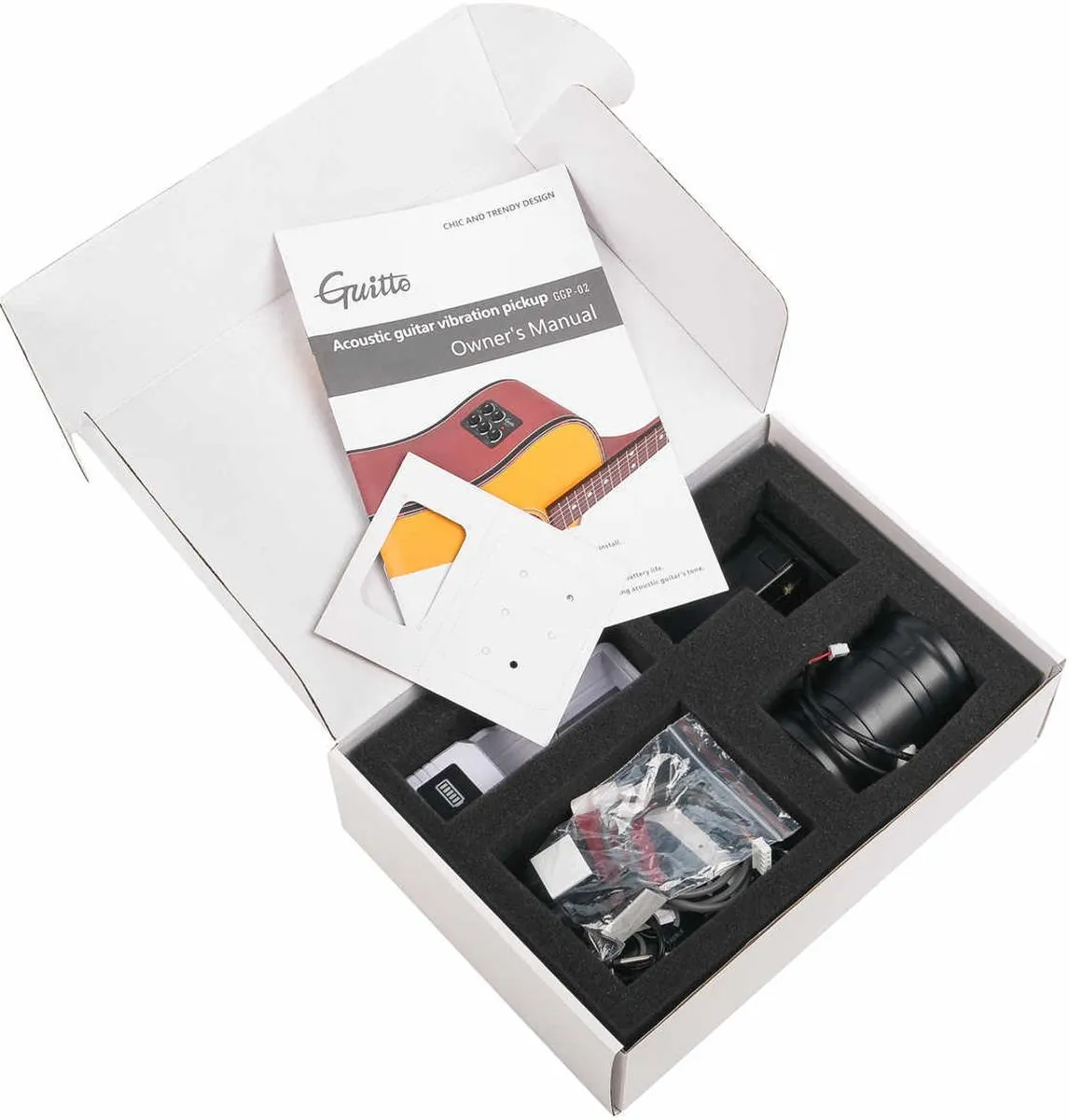 GGP-02 — новый звукосниматель Guitto для акустической гитары. Динамик, прикрепленный к деке инструмента, создает эффекты реверберации, дилея и хоруса без подключения к усилителю. Гитарный сигнал, снятый пьезоэлектрическим датчиком, обрабатывается цифровым процессором и управляет вибрационным устройством. Этот процесс повторяется снова и снова, значительно усиливая влажный сигнал. Процессор обработки сигнала позволяет настраивать ревер, дилей, хорус, верхние и нижние частоты (Reverb, Delay, Chorus, Treble и Bass). Литиевая батарея обеспечивает непрерывную работу в течение 12 часов. Механический блок вибрации, обеспечивает более естественное звучание. Очень низкий уровень шума. Благодаря технологии многослойного экранирования, GGP-02 обладает сильной помехоустойчивостью, при подключении к усилителю практически отсутствует фоновый шум. Подходит для классических и акустических гитар размером 36-42 дюйма.