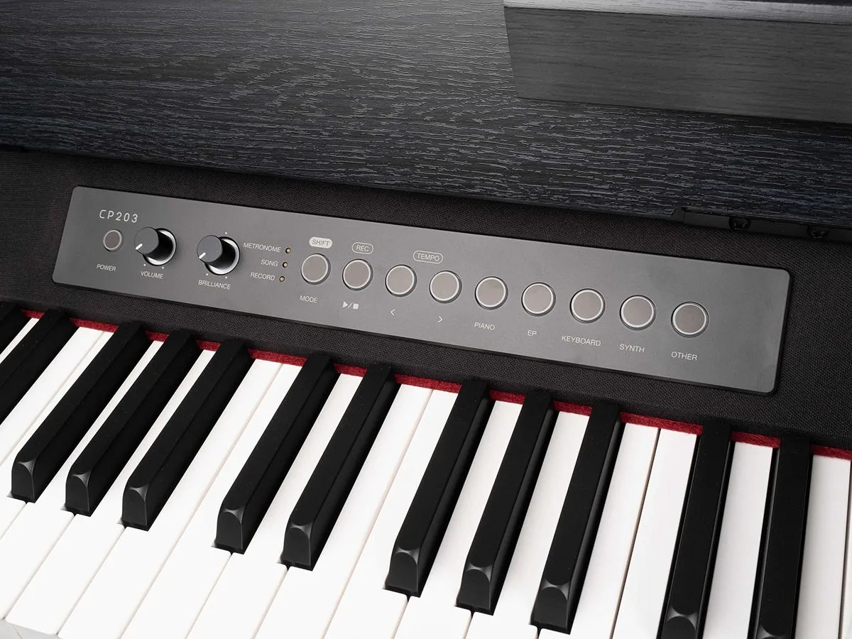 CP203 сочетает в себе весь опыт создания цифровых фортепиано Medeli в компактном корпусе, от флагманского звука немецкого рояля до 192-нотной полифонии, от совместимости с приложением PianoToolbox до всех параметров звука фортепиано, таких как шум молоточков или резонанс струн. Недавно разработанная компактная клавиатура с градуированным действием (GAC) предлагает полностью взвешенный молоточковый механизм в самом компактном размере. Кроме того, новый эксклюзивный звук японского рояля, тщательно записанные новые встроенные песни и новый педальный блок с поддержкой полудемпфирования — все это отражает эволюцию Medeli во всех направлениях. Клавиатура: 88 клавиш. Чувствительность к касанию: есть. Тип: градуированная, молоточковая, тип GAC. Полифония: 192 (макс). Голоса: 30 тембров. Стили / ритмы: 50 ритмов. Музыкальная библиотека: 100 композиций. Усилитель: 2 x 20 Вт. Динамики: 2 x 6 см, 2 x 12 см. Входы / выходы: USB-B MIDI и аудио, MIDI-порт выход, наушники 1/4" и 1/8", вход 1/8", выход 1/4", педальный блок, сустейн, экспрессия. Разделение клавиатуры: есть. Наложение тембров: 2 слоя (R1, R2). Режим "Дуэт" (TWINOVA): есть. Управление стилем / ритмом: старт/стоп, громкость ритма. Реверберация: 2 типа, 10 уровней. Хорус: 10 уровней. Эффекты: D. A. S. Секвенсор: 1 пользовательская композиция. Настройка высоты тона: транспонирование, октавный перенос, выбор частоты камертона, настройка лада. Метроном: есть (ритмический паттерн). Темп: 5-320. Прочие функции: чувствительность к касанию, моделирование акустики фортепиано, приложение Toolbox для Android и iOS. Питание: постоянный ток 12 В. Размеры: 1352 x 298 x 788 мм. Вес: 40,5 кг.