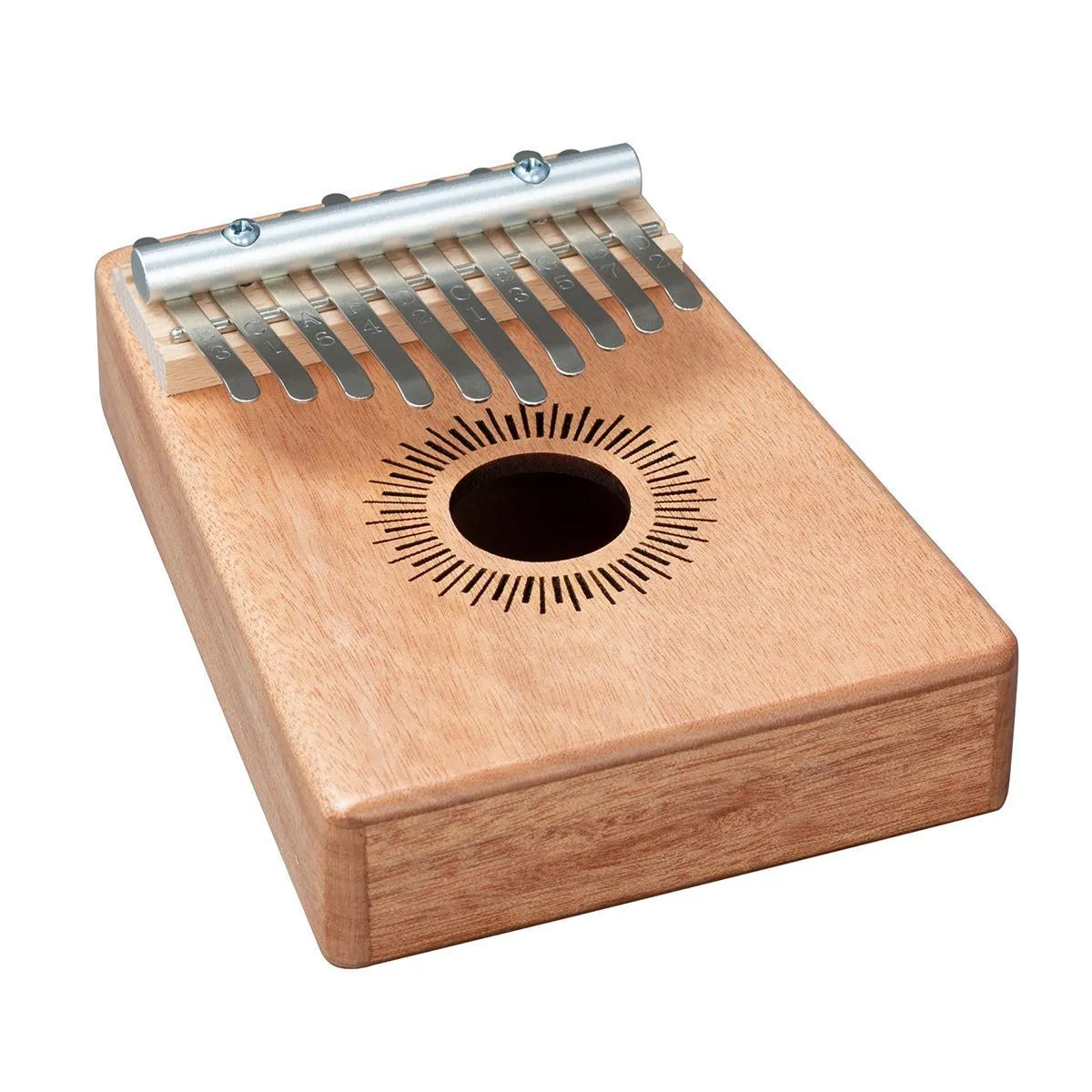 Калимба изготовлена из высококачественного красного дерева. Корпус усиливает низкие частоты и, таким образом, производит полный, чистый и теплый звук с завораживающим резонансом. Высококачественные металлические язычки настроены в до мажоре и имеют диапазон от c' - e'' (C4 - E5). Обозначение нот на язычках делают калимбу подходящей как для начинающих, так и для опытных музыкантов.